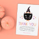 Cette carte de remerciement mignonne présente un chat noir dessiné à la main (portant un chapeau de sorcière), avec des accents rose et pêche pastel. Le texte moderne indique "MERCI" en violet, pêche et rose pastel. Des modèles de texte sont inclus pour une personnalisation facile. Idéal pour envoyer après une fête d'anniversaire sur le thème des chats ou d'Halloween ! Le verso de la carte contient des étoiles pastel assorties sur fond noir.