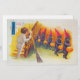 Dieses Design zeigt ein Bild einer Postkarte aus dem frühen 20. Jahrhundert, die Halloween feiert. Es zeigt einen Jungen, der eine Kerze hält, der erschreckt ist, eine Parade menschlicher schwarzer Katzen zu sehen, die rote Kegel tragen und Jack-o'-Laternen aus Kürbissen tragen.