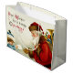Nostalgisches Bild eines rot-roten Weihnachtsmannes aus der Viktorianischen Zeit, der eine Tüte Spielzeug trägt, das einen Brief von einem schüchternen Kind in blauer Mantel und Hut bekommt.