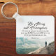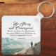 Der inspirierende Schlüsselanhänger der individuellen Schrift zeigt eine Person, die auf einem Weg über einem wunderschönen Bergtal spaziert. Es zeigt Bible Verse Joshua 1:9, "Sei stark und mutig. Fürchte dich nicht; lass dich nicht entmutigen, denn der Herr, dein Gott wird bei dir sein, wohin du auch gehst." _