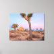 Das Bild erfasst eine ruhige Wüstenlandschaft mit Joshua-Bäumen unter einem pastellfarbenen Himmel. Ein prominenter Joshua Tree steht im Vordergrund, sein Stamm strukturiert und verzweigt in zwei verschiedene Arme. Im Hintergrund sind Felsen und mehrere kleinere Joshua-Bäume auf dem trockenen Gelände. Der Himmel wechselt von einem weichen Blau zu einem sanften Rosa, wenn die Sonne aufgeht.