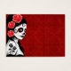 Cette conception inspirée du Jour des Morts présente une belle femme avec des motifs crâniens de sucre sur son visage. Trois roses apparaissent dans ses cheveux noirs à jet avec deux roses de plus tatoués sur son bras. La fille se tient sur le côté, la tête légèrement tournée vers le spectateur. Sa peau blanche pure se distingue vraiment par ses cheveux noirs et sa robe ainsi que par son arrière - plan rouge profond légèrement texturé. Ce design unique est une représentation époustouflante de ce Jour de la femme morte.