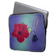 Hummingvogel und roter Hibiskus auf einem lila, blauen Hintergrund.