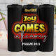 Diese wirkungsvolle Grafik zeigt "Joy COMES in the mornig" in lebendigem, gelb, fett orange und elegant weißem Skript, das "PSALM 30:5" zitiert. Die aufregende Botschaft strahlt vor einem krassen schwarzen Hintergrund, mit einer mächtigen rot-orangefarbenen Aura hinter dem Text. Dieses Design symbolisiert wunderbar die Ankunft von Hoffnung und neuem Glück.