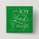 Pinback-Taste mit trendiger Typografie aus dem Vers in Nehemiah 8:10, "... für die Freude des Herrn ist deine Stärke." Hintergrund (grün) kann an die Farbe Ihrer Wahl angepasst werden. Entworfen von Simply Scripture von Robin.