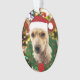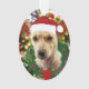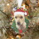 Digitales Kunstgemälde eines jungen Weihnachtsjunges mit Kranz, Weihnachtsmannmütze und dekoriertem Baum.