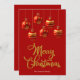 Joyeux Noël dans une police de caractères décorative fantaisie en couleur dorée avec des tons rouge et or accrochés à la conception des billes de Noël. Cette carte de Noël rouge arrière - plan est conçue pour que vous puissiez changer la couleur de l'arrière - plan et aussi entrer votre nom de famille ou le supprimer si vous souhaitez seulement avoir le design sans le texte.
