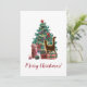 Carte de voeux de Noël artistique et unique (cartes de voeux de Nouvel An de l'Union Soviétique inspirées) avec un arbre de Noël coloré, une étoile rouge sur le dessus, une guirlande, des lumières des arbres de Noël, des cadeaux fantaisistes et un chat orange coquin. Joyeuse carte de voeux de Noël !