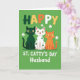 Cette carte montre trois chats stylisés alignés sur un fond vert émeraude profond, leurs corps disposés en une rangée horizontale régulière qui procure une sensation de proximité et de convivialité 💚. À gauche est assis un chat vert forêt aux yeux jaunes perçants, penché légèrement vers le centre comme s'il tenait compagnie aux autres. Au milieu, un chat blanc est parsemé de petites formes de trèfles à quatre feuilles, et son visage calme semble croiser le regard du chat de gauche d'une manière silencieusement affectueuse ☘️. À droite, un chat orange-roux complète le trio avec un doux sourire qui correspond à l'ambiance amicale du groupe. Des trèfles à quatre feuilles blancs flottent autour d'eux comme des confettis légers, remplissant l'espace sans encombrer les chats. Près du haut, « HAPPY » apparaît en lettres arrondies, alternant le vert clair, l'orange et le blanc sur le mot. Le long du bas, « ST