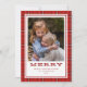 Cette carte de Noël cosy et festive comprend une seule photo et le mot "joyeux" sur un arrière - plan rouge plaid. Il comprend également de l'espace pour des salutations courtes ainsi que votre nom et l'année.