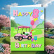 Une voiturette de golf à pois roses se trouve joliment au bord du green, surmontée d'un gâteau de golf sur le thème de l'anniversaire et garée près d'une épingle à drapeau numéro 8. De l'autre côté, des cadeaux colorés et des ballons d'hélium surlignés par un ballon numéro 8 créent la scène idéale pour la célébration du deuxième anniversaire d'une petite fille.