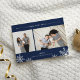 Elégant et moderne carte photo de vacances dispose de deux photos préférées alignées côte à côte, avec "Bonne Année" en haut en italique blanc et typographie de bloc. Personnalisez avec votre salutation personnalisée et votre nom en bas, accentué par quatre illustrations de flocon blanc. Un riche arrière - plan bleu marine ajoute une élégance classique à votre accueil de vacances. La carte revient à un motif de chute de neige en gris chic.
