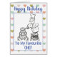 Dessin du chef. Une femme est au sommet d'un stepladder givrant un gâteau. Personnalisez avec votre choix de texte et de message intérieur. Carte d'anniversaire pour une cuisinière.