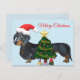 Un dachshund noir et bronzé portant un chapeau de Père Noël, derrière un bel arbre de Noël.