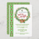 Une invitation à la fête de Noël avec une couronne d'aquarelle. Seringues de pin vert, cônes de pin et baies décoratives composent cette couronne festive. À l'intérieur de la couronne sont quelques ornements décoratifs et les mots" mai vos jours être Joyeux et lumineux. Écrit dans une police rouge tendance. Un motif vert et rouge avec des carrés fantaisistes le long de la frontière.