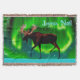 Ein immer leicht stilisiertes Bild eines Elchs, der gegen die Nordlichter silbrig geschmückt ist. "Joyeux Noё l" erscheint in blau und weiß.
