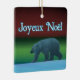 Ein Eisbär wandert in der langen Polarnacht durch das Eis; die Nordlichter in rot und grün leuchten in der Ferne. Französischer Text, "Joyeux Noё l" erscheint in leuchtend blau und weiß.