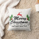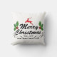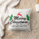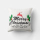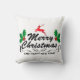 Un oreiller à jetons blanc au design festif. Le design inclut les mots "Joyeux Noël" dans une police de caractères décoratifs en noir, avec des fleurs allant des extrémités des mots. Au-dessus de "Joyeux Noël" est une silhouette rouge d'un renne qui sautent, et de chaque côté sont des sprigs de saint avec des feuilles verts et des baies rouges. Sous le texte principal, "ET HEUREUX NOUVEL AN !" est imprimé en noir simple et gras. L'ensemble est propre et graphique, adapté à la décoration de vacances.
