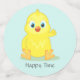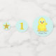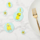 Joyeux poussin avec étoile sur bleu clair confetti table de fête. Texte prêt à être personnalisé. Idéal pour le baby shower, le premier anniversaire et plus.