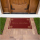 Tapis de porte avec un arrière - plan bordeaux rouge profond, des bordures argentées et dorées entourant le tapis de porte et l'expression "Joyeux Noël" dans un texte optimisé de couleur or près du fond du mat de porte et quatre flocons de neige de couleur or.