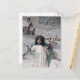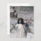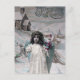 Eine Vintage französische Weihnachtspostkarte aus dem öffentlichen Bereich. Es zeigt ein Mädchen, das als Weihnachtsengel gekleidet ist und Geschenke trägt.