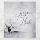 Joyeux Weihnachten Flaschenweinetiketten mit einem Aquarellbild mit einem Rentier aus schwarzer Silhouette, der unter einigen Kiefern stehend ist. Graues Schwarz-Weiß-Farbschema mit neutraler Farbe.