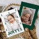 Festliche Weihnachtskarte aus dem Foto, umgeben von grünen, handgezeichnet Kiefern mit weißem Hintergrund. "Joyful" wird in fett grün mit Ihrem persönlichen Gruß und Familiennamen angezeigt. Die fröhliche Weihnachtskarte kehrt um, um ein zusätzliches Foto und einen grünen Hintergrund mit subtilen weißen Punkten anzuzeigen.
