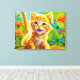 Ein niedliches, orangefarbenes Kätzchen, das in einem Blumengarten mit farbenfrohen Libellen schmiedet.
