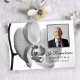 Erleben Sie ein Jahr nach dem Besuch der eleganten Orchideen-Blume zum Tode zum Jubiläum Ihre Lieben. Diese hübsche individuelle Feier der Gedenkfeier Leben laden ein Schwarz-Weiß-Blumenfoto von weißen Phalaenopsis orchid Blume Blüte auf dem Stiel mit einem weißen Hintergrund.