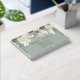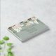 Ein wunderschönes Gästebuch mit Goldfolie und einem cremefarbenen Rahmen auf Salbeihintergrund. Text ist ein großer glücklicher Jubiläum; "Willkommen zu unserem Feiern", dann Braut und Bräutigam Namen.