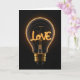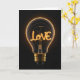 Eine Glühbirne mit dem Wort "LIEBE", die darin leuchtet, leuchtet vor einem dunklen Hintergrund. Inside text kann geändert werden.