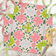Lebhaftes Gewebe-Papier-Design mit einem nahtlosen Muster aus symmetrischen abstrakten Formen in Rosa, Grün und Grau.