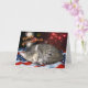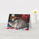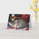 Tabby Katze schlafend auf Fahne mit Feuerwerk im Hintergrund und Text "Happy 4. Juli"