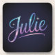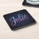 Dieses Untersetzer-Set enthält das stilisierte Skript "Julie" in einem Farbverlauf. Die Namensfarbe wechselt von hellblau zu rosa mit Imitaten silberne Glitzern. Der Name Julie ist in einem Glam-Skript-Schriftart mit fließenden Kurven und dekorativen Schnörkeln geschrieben. Der Hintergrund ist ein marineblau, das sich allmählich zu den Kanten hin verdunkelt und so einen Vignetteneffekt erzeugt. Das Design hat eine magische, ätherische Qualität mit den funkelnden Effekten, die dem Skript ein kosmisches, sterniges Aussehen verleihen. Die Untersetzer sind harte Untersetzer aus Kunststoff mit Korkrücken. Es sind sechs Untersetzer im Set.