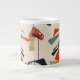 Mit dieser modernen, inspirierten Jumbo-Tasse aus der Mitte des Jahrhunderts kann jeder Tag ein Blitz aus der Vergangenheit werden. Das Design ist eine Nachbildung eines Vintagen atomaren mobilen Stoffmusters. Der Hintergrund ist mit blauen, orangefarbenen, grünen und schwarzen modernen Kunstformen gestaltet.