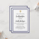Eine moderne, elegante und bestätigte Einladung. Weiß mit marineblau gestrichenen Rahmen und goldenem Kreuz. Personalisieren und fügen Sie einen Namen und Details. Schwarze Buchstaben.