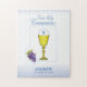 Kommunion zum ersten Mal zu erhalten ist sehr besondere Anlass. Dieses Gratulationsgeschenk, Souvenir, Geschenk und Party, das für einen Jungen auf seiner ersten heiligen Kommunion ist, wird perfekt mit der Kalice und Gastgeber und Trauben mit einem weichen blauen Hintergrund.
