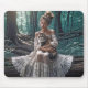 Eine Frau sitzt anmutig auf einem gefallenen Baum in einem üppig grünen Wald und krabbelt eine flauschige Katze in ihren Armen