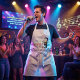Junge singt mit Drei-Schweine-Chor Schürze