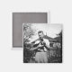 Ein junger Mann, der eine Katze hält, ist ein bezauberndes Foto auf diesem Magneten. Sicher, auf diesem Kühlschrank sieht es toll aus.