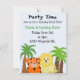 Der niedlichste kleine Tiger und ein geselliger Löwe mit einem großen Manakzent laden zum Geburtstag dieses spaßigen Dschungels ein. Im Hintergrund blühen Palmen. Passen Sie Ihre persönlichen Daten auf Wunsch an. Eine lustige Zoo-Tier-Einladung.