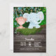Eine hübsche Aquarellillustrierung eines kleinen Affen und eines babyblauen Elefanten, der seine Pfoten über einem dunkelbraunen, horizontalen Holzzaun hängt, der eine Moosschicht enthält. Sie sind von hängenden Weinreben umgeben und von den Blätter der Bäume im Hintergrund, die hübsche Imitate strahlen Lichter in ihnen. Die weißen Vorlagen können personalisiert sein, um Ihre Anforderungen zu Anzug. Ideal für Safari; Dschungel- und Zootheater mit Babydusche Party.
