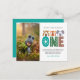 Moderne, trendige Junge ersten Geburtstag danke Ihnen Postcard. Design mit Dschungeltieren und Nummer eins in trendigen bunten Schriften , danke Ihnen Nachricht und ein Foto.