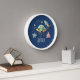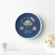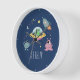 Diese niedliche, moderne Kinderuhr verfügt über einen Space Alien Cartoon, mit einem Raketenschiff, Außerirdischen, Sternen und Mond, und kann mit Ihrem Jungs Namen personalisiert werden. Das perfekte marineblaue Ambiente, das zusätzlich zum Kinderzimmer oder dem Baby-Kinderzimmer geboten wird. Ideal für Alien- oder Galaxieliebhaber!