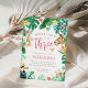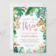 Erleben Sie den 3. Geburtstag Ihres Kindes auf der sommerlichen Party des tropischen Dschungels mit diesen bunten Einladungen. Das schicke Design der Insel umfasst Monstera-Blätter und grünes Aquarell mit Affen, Faultier, Kolibri und Papagei. Farbenfrohe tropische Blumenakzente runden das Design ab. Personalisieren Sie mit dem Namen Ihres Kindes in lebhaften rosa Schriftzeichen, zusammen mit dem Party Anlass und Details. "Young, Wild & Three" erscheint oben.