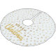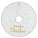 Ajoutez cette jupe d'arbre de Noël élégante et festive à vos décorations de maisons de vacances. Conçu avec du texte : Joyeux Noël, entouré de grappes d'étoiles de couleur or sur un arrière - plan blanc doux.