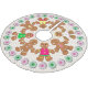 De mignons biscuits de pain d'épices, garçons et filles, alternent autour de cette jupe d'arbre de vacances. Une bordure de bonbons roses et vertes coordonnées avec les couleurs des biscuits. L'arrière - plan est en damier beige clair et blanc.
