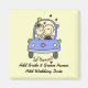 Ein individualisierbarer Just Married Hochzeitsmagnet mit einem Braut- und Bräutigam-Strichmännchen im Hochzeitsfahrzeug, Text mit dem Titel "Just Married!" und einem Ort, an dem man Braut und Bräutigam einfach seinen Namen und das Hochzeitsdatum hinzufügen kann!