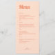 Ein Hochzeitsmenü mit orangefarbener Retro-Typografie auf pfirsichfarbenem Hintergrund mit kleinem Sonnendesign ist eine stilvolle und einzigartige Wahl für einen besondere Anlass. Die fetten, hellen orangefarbenen Buchstaben heben sich vom pfirsichfarbenen Hintergrund ab und schaffen einen auffallenden visuellen Kontrast. Die Speisekarte wird durch ein kleines Sonnendesign ergänzt, das dem Gesamtbild eine Touch von Lustigkeit und Verspieltheit verleiht. Das Sonnendesign verleiht der Speisekarte ein fröhliches Ambiente und ist somit perfekt für eine angenehme Hochzeitsfeier. Der pfirsichfarbene Hintergrund und die Retro-Orangentypografie verleihen dem Speiseplan ein Vintages Ambiente, das sich perfekt für eine Retro-Hochzeit eignet. Insgesamt ist dieses Hochzeitsmenü eine schöne und einzigartige Wahl für einen unvergesslichen und besondere Anlass.