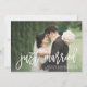 Nos annonces mariages chic et modernes sont la meilleure façon de faire connaître à vos amis et à votre famille votre évènement, cérémonie secrète ou mariage privé! "Just Married" est recouvert d'une brosse de style manuscrit blanc sur votre photo préférée à fond saigné horizontal ou orienté paysage. Personnalisez avec vos noms et dates de mariage ainsi qu'un message personnel au verso.